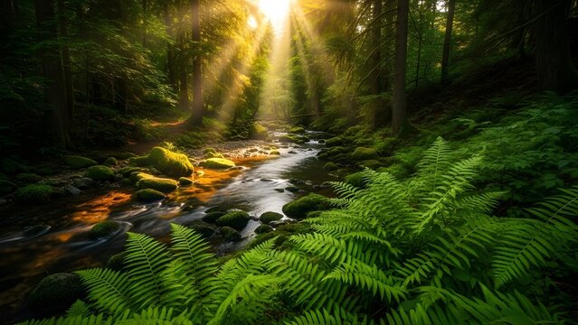 Postal horizontal en la montaña. Pradera en primavera con flores y pequeño arroyo en primer plano. Sensación de libertad. Imagen con desenfoque. IA generativa
