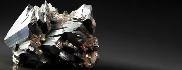 Arsenopyrite is a rare precious natural stone on a black background. AI generated. Header banner mockup with space.