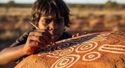 Aboriginal boy painting traditional art on rock in natural setting