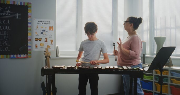 A music teacher guiding a student on a drum kit within a music rehearsal studio.
