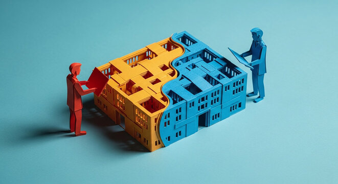 Digital art of API integration concept. Two puzzle pieces interlock against futuristic abstract tech-inspired background connectivity, AI. Data exchange, digital transformation, system, network