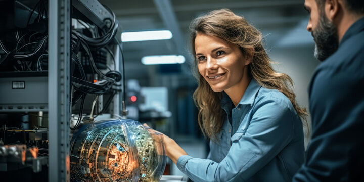 Woman face overlaid glowing circuit board pattern. Symbolizes tech integration with humanity. Futuristic, digital art, science fiction illustration shows modern ai artificial intelligence concept.