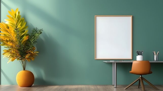 Minimalist home office setup with empty frame and metal desk