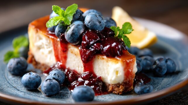 An irresistible cheesecake adorned with a rich berry sauce, bluebs, and a touch of lemon, representing indulgence and luxury for dessert lovers and food aesthetics.