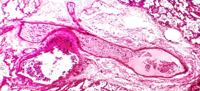 Thrombus inside blood vessel, light micrograph, hematoxylin and eosin staining