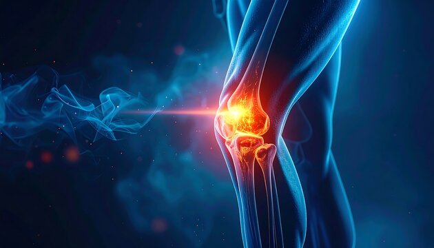 Detailed digital rendering showcasing knee anatomy, highlighting pain and inflammation through vibrant red and orange hues
