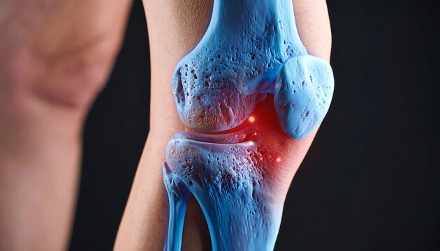 A Medical X-ray visualization of a human knee joint showing red areas of pain and inflammation.