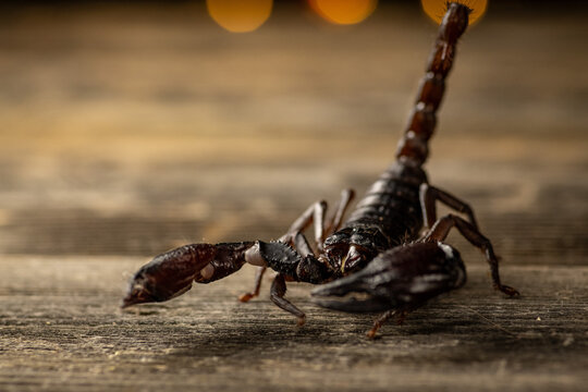 Close-up of an Asian forest scorpion (Heterometrus species) photographed with shallow depth of field on a natural surface. Concept of arthropods, exotic pets, wildlife, and macro animal photography.