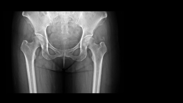 Film X-ray hip radiograph showing calcium deposit on abductor tendon of right hip (calcific tendinitis or tendinosis calcarea). This calcified tendon cause hip pain and swelling.