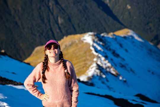 Portrait of happy girl standing on summit of Avalanche Peak enjoying breathtaking views of snow covered mountains, Arthurs Pass National Park, Canterbury, South Island, New Zealand