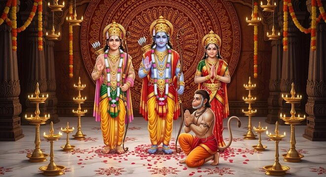 Lord rama family darshan with hanuman in temple indian god hinduism religious festival puja arti