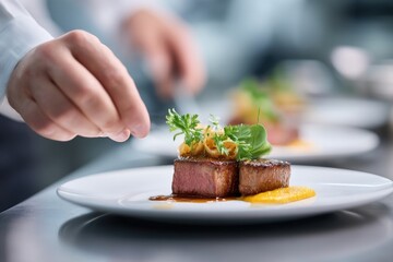 Delicate plating of gourmet dish with vibrant garnishes and arti