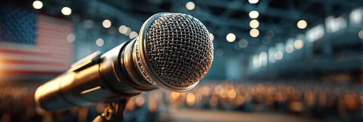 Focus on microphone in venue filled with audience during speech event