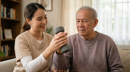 A skilled prosthetist fitting a high-tech prosthetic leg onto a smiling female patient.