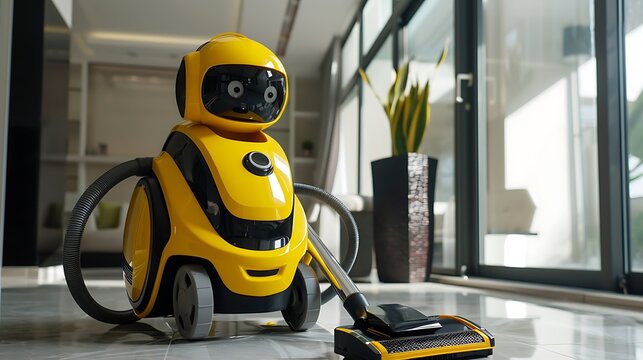 Cleaning households in an upright vacuum cleaner is a lifelike yellow robot