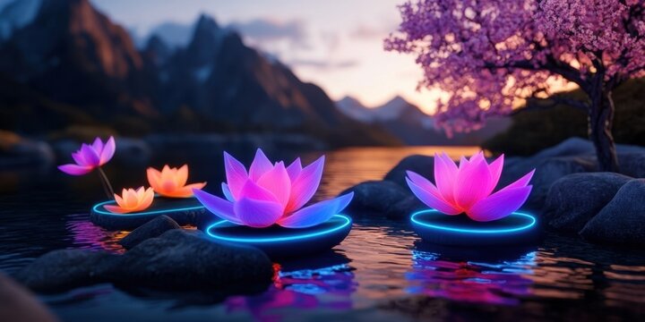 A glowing Zen pond with floating lotus flowers, surrounded by holographic cherry trees that sway in an artificial breeze.