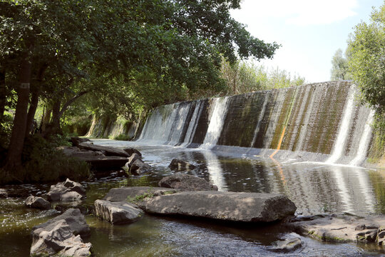 An abandoned dam, an artificial waterfall, the dam of the Butka HPP, is located up the river behind the bridge over the Hirsky Tikich.