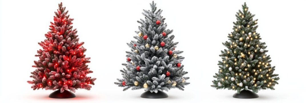 Three beautifully decorated artificial Christmas trees with vibrant lights on a bright, white background ready for holiday cheer