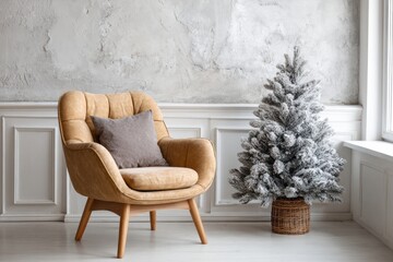 Comfortable upholstered chair sits next to a flocked artificial evergreen tree indoors