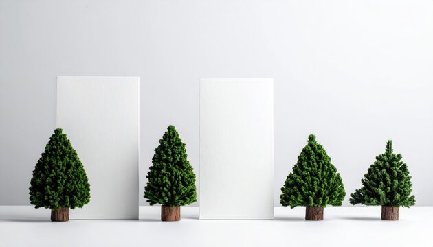Minimalist arrangement of four small artificial evergreen trees on a white background.