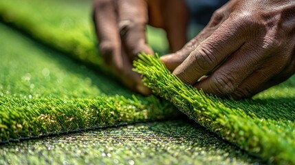 Hands arranging artificial turf creating perfect seamless surface for landscaping