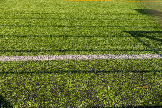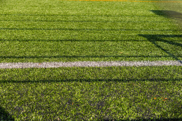 White paint on soccer field green artificial grass and shadows of a fence surrounding the playground