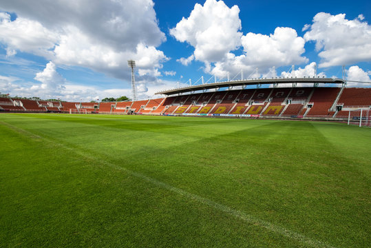 Green synthetic artificial grass soccer sports field with white corner stripe line next to modern school building at background