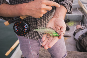Fly fisherman chooses artificial flies from lures box for fly fishing at river. Blurry close up.