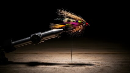 A colorful handcrafted fishing fly held in a flytying vise on a rustic wooden surface with a dark background.
