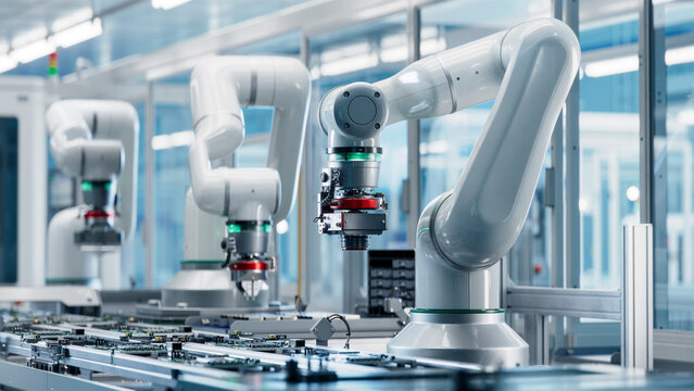 Advanced High Precision Robot Arms inside Bright Electronics Factory. Fully Automated Modern PCB Assembly Line. Electronic Devices Production Industry. Quality Control of Circuit Board