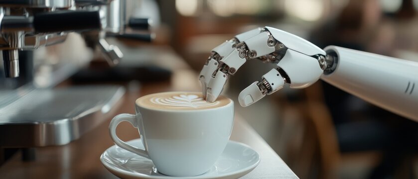 A robot's mechanical hand gracefully holds a steaming cup of latte, exploring the intersection of technology and everyday human rituals.