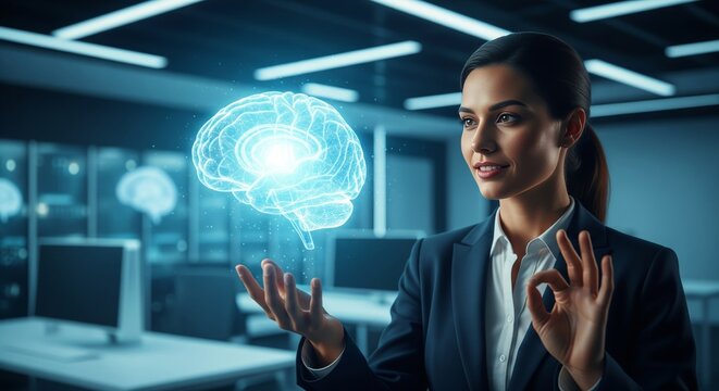 Professional Woman Touching Digital Brain Interface. businesswoman interacting, translucent 3D artificial intelligence brain model floating in the air. Represents AI integration, machine learning