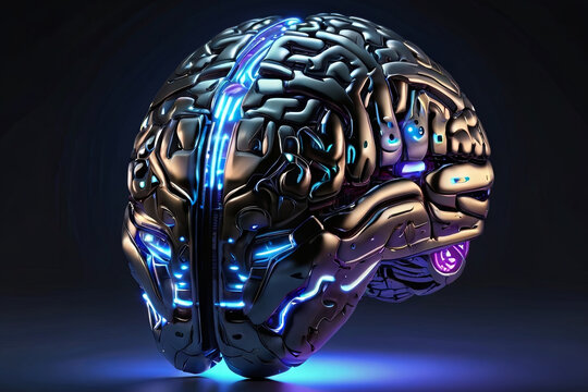 Digital AI electronic brain. Metallic with neon light, neural data storage machine. Futuristic technology concept. SEO-friendly image