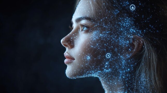 Futuristic portrait of a woman with glowing digital brain overlay, symbolizing artificial intelligence, cognitive thinking, and neural networks.