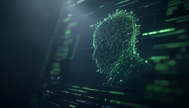 A digital silhouette composed of luminous green particles against a dark background, suggesting themes of technology and artificial intelligence.