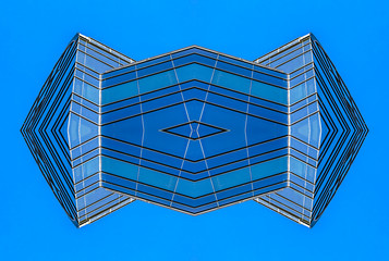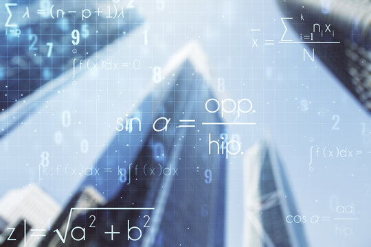 Scientific formula hologram on blurry cityscape background, research concept. Multiexposure