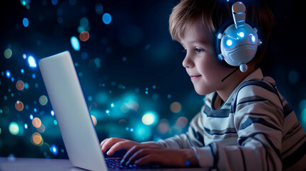 Child using keyboard with digital data graphics, artificial intelligence icons and education technology interface overlay, Conceptual image of AI based personalized and adaptive learning.