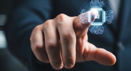 Man touching a digital AI chip representing artificial intelligence and machine learning