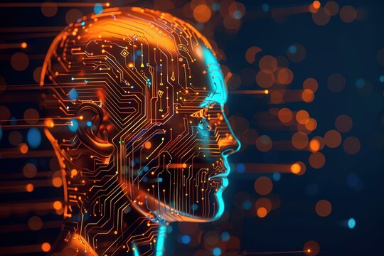 futuristic artificial intelligence concept with a digital human brain glowing on a high tech computer motherboard circuit board representing machine learning neural networks and data processing