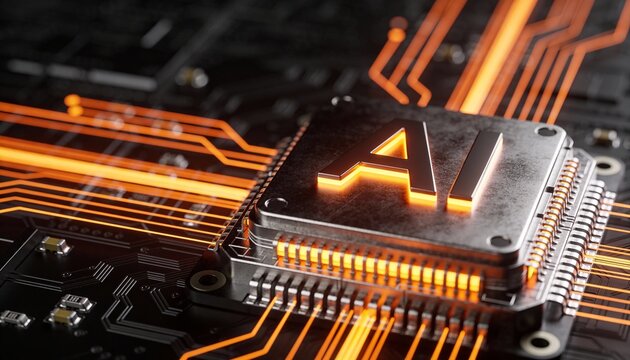 High quality image of closeup view of a glowing orange central processing unit on a circuit board with intricate pathways and components, symbolizing advanced technology and data processing