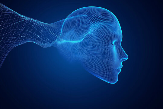 Digital Representation of a Human Head with Mesh Overlay and Particles in Technology Background
