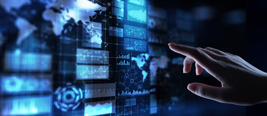 Business intelligence dashboard with graph and icons. Big data. Trading and investment. Modern technology concept on virtual screen.