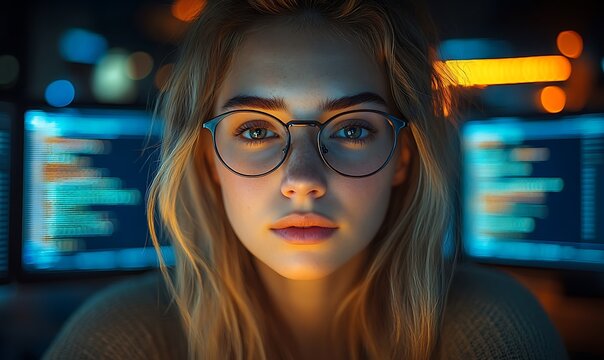 Artificial intelligence woman working facing multiple computer screens in a dark room. Futuristic ai technology concept with data monitoring.