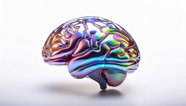 futuristic holographic brain with iridescent reflective surface symbolizing artificial intelligence neuroscience and digital thinking isolated on white background