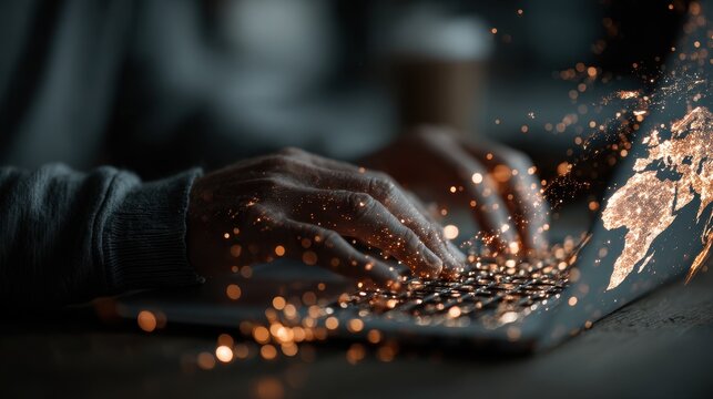 Person typing on laptop with digital network overlayed on hands in a dark environment