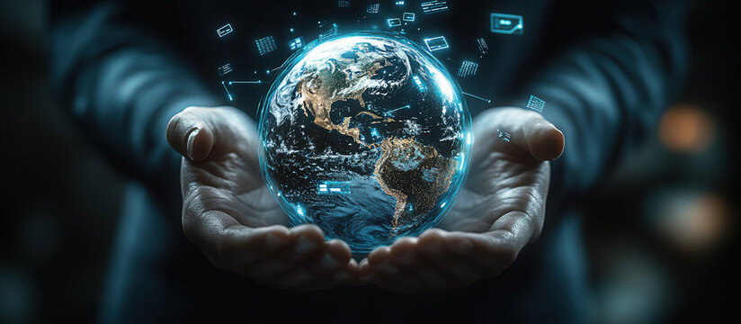 Hands holding a glowing Earth with digital data overlays in a futuristic setting