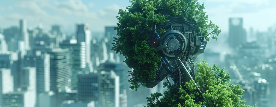 concept of Pollution, an AI Robot new model with tree all over, City background, dynamic color blend, copy space for text , realistic photo high detailed