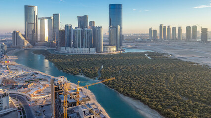 Buildings on Al Reem island in Abu Dhabi day to night timelapse from above.