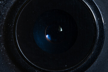 Professional camera lens against dark background