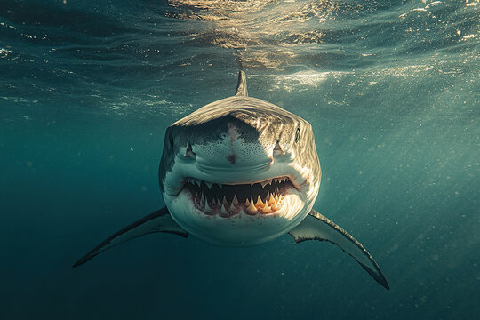 Underwater photo of a large shark with its mouth open. Generated by artificial intelligence